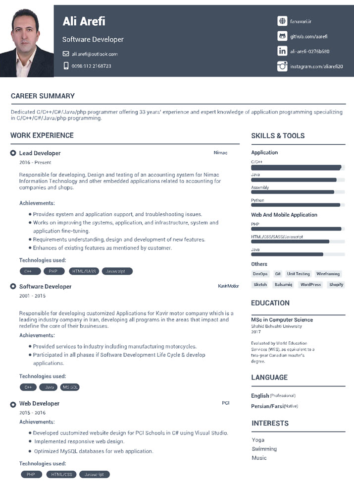 کارشناس ارشد علوم کامپیوتر از دانشگاه شهید بهشتی هستم و با 33 سابقه بعنوان یک برنامه «نویس حرفهای» دانش، مهارت و تجربه لازم برای به نتیجه رساندن هر نوع پروژه طراحی نرمافزار و برنامهنویسی را دارم. من از لحظه به لحظه مراحل طراحی و کدنویسی نرمافزار لذت میبرم.